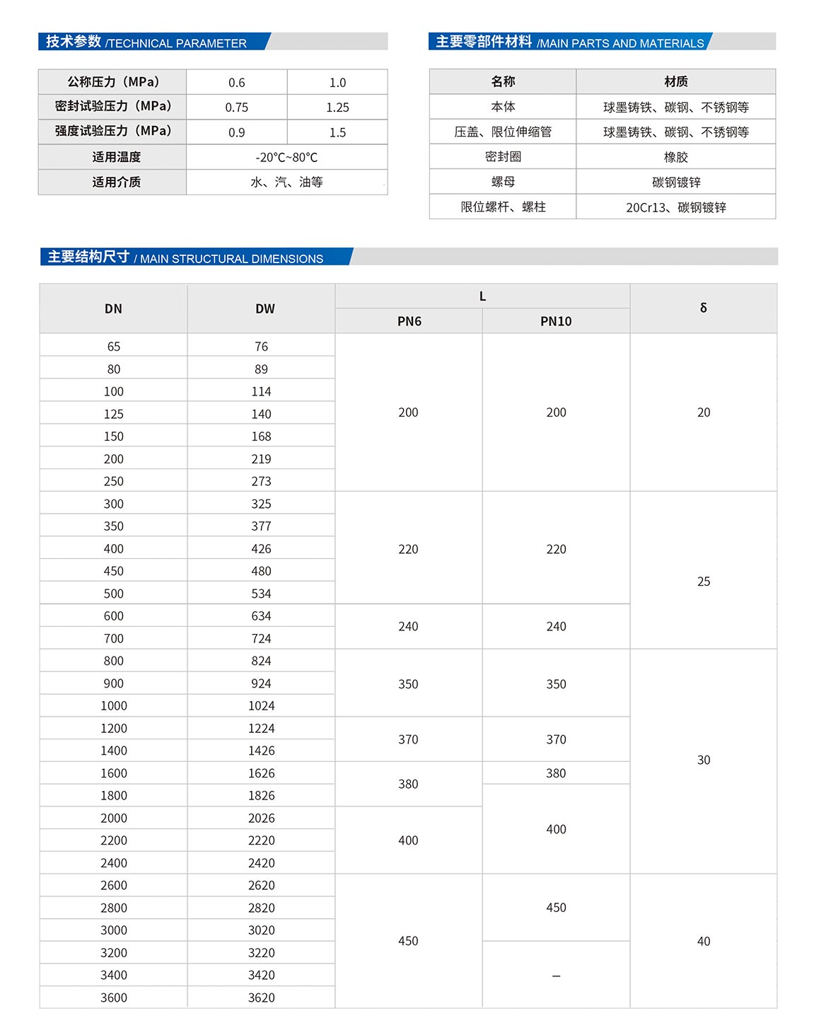雙法蘭傳力接頭:由本體,密封圈,壓蓋,伸縮短管等主要部件組成。該產(chǎn)品適用于兩邊均為法蘭連接的管道中,安裝時(shí)調(diào)節(jié)產(chǎn)品兩端的法蘭的安裝長度,對(duì)角均勻擰緊壓蓋螺栓,使其成為一個(gè)整體,并有一定的調(diào)節(jié)量,方便安裝維修時(shí),根據(jù)現(xiàn)場(chǎng)尺寸進(jìn)行調(diào)整。在工作時(shí)可以反軸向推力傳遞至整個(gè)管道。雙法蘭傳力接頭是由法蘭松套伸縮接頭和短管法蘭,傳力螺桿等構(gòu)件組成,能降低被連接件的壓力推力(盲板力)和補(bǔ)償管路安裝誤差。雙法蘭傳力接主要用于泵、閥門等附件的松套連接。